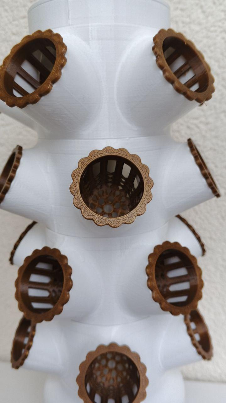 Настольная гидропонная система на 20 посадочных мест (четыре секции и четыре расширителя по 3 см). Каждая секция на пять посадочных мест (внутренний диаметр посадочного места - 37 мм, глубина - 54 мм), диаметр ствола башни - 10 см. Настольную гидропонную башню можно расширять до десяти и более секций, если объём ведра будет достаточным - оптимально ок 10 литров, для 3-5ти секций достаточно 5ти литров. Сделана из пищевого пластика. Высота четырёх секций - 42 см (без ведра - приобретается отдельно).